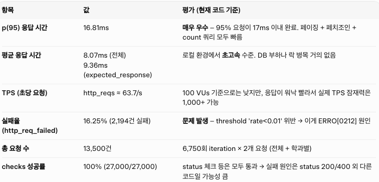 페이징 성능 자체는 매우 훌륭함 100명 동시에도 평균 8ms, p17ms → 로컬에서 초당 수천 건 처리 가능 수준 enrolled=0 상태라 count 쿼리도 거의 부하 없음 (신청 시작 후에는 조금 느려질 수 있음)